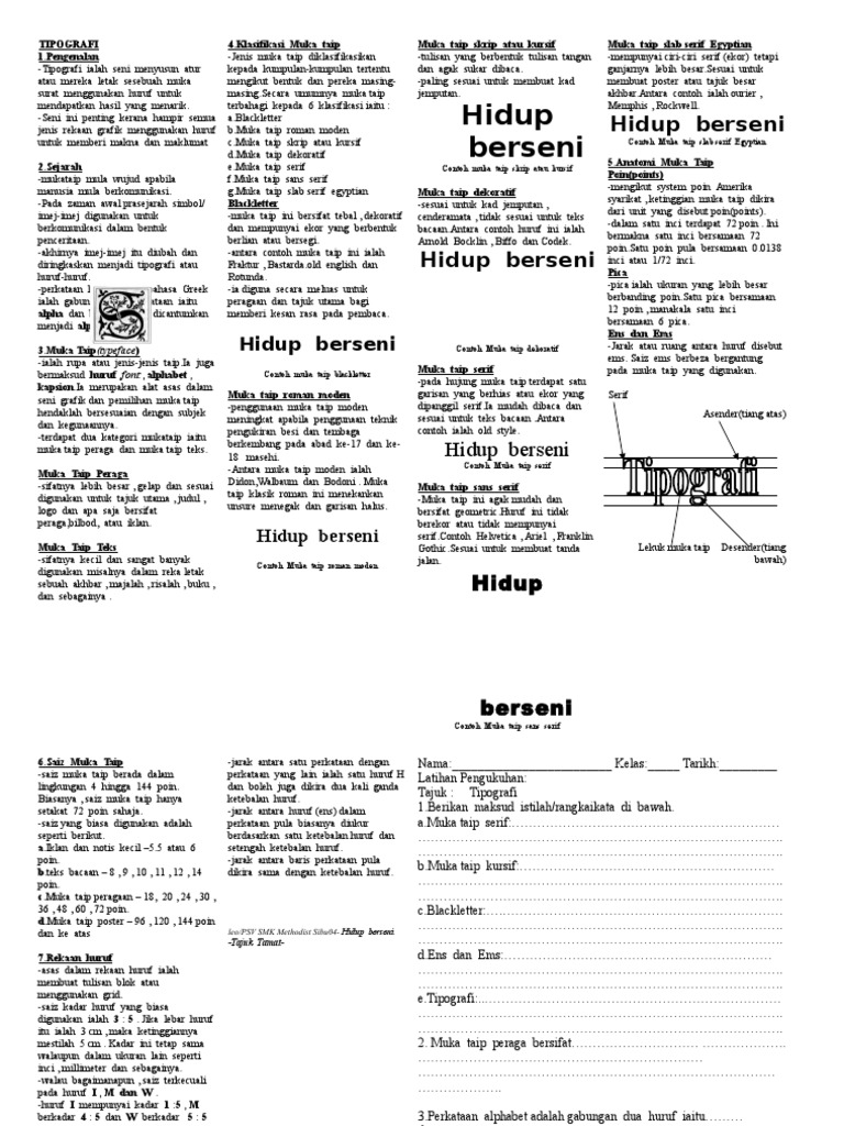 Nota Seni Ting 1 Lenkap Pdf Document from reader015.fdokumen.site Menggunakan muka taip bersama ilustrasi dalam bentuk lukisan, gambar atau foto. Pelajar memilih huruf muka taip daripada surat khabar,majalah atau sumber yang berkaitan dan potong huruf menggunakan pisau di atas papan pemotong. 2.5 kesan bayang dan garis rupa. Mungkin ada yang belum tahu cara taip huruf jawi di handphone kan? Rupa muka taip boleh menghasilkan pelbagai gaya. Ia juga mungkin menyertakan ideogram dan simbol, atau mengandungi kesemua mereka, contohnya. Rupa muka taip boleh menghasilkan pelbagai gaya. See more ideas about typography inspiration, lettering, typography design.